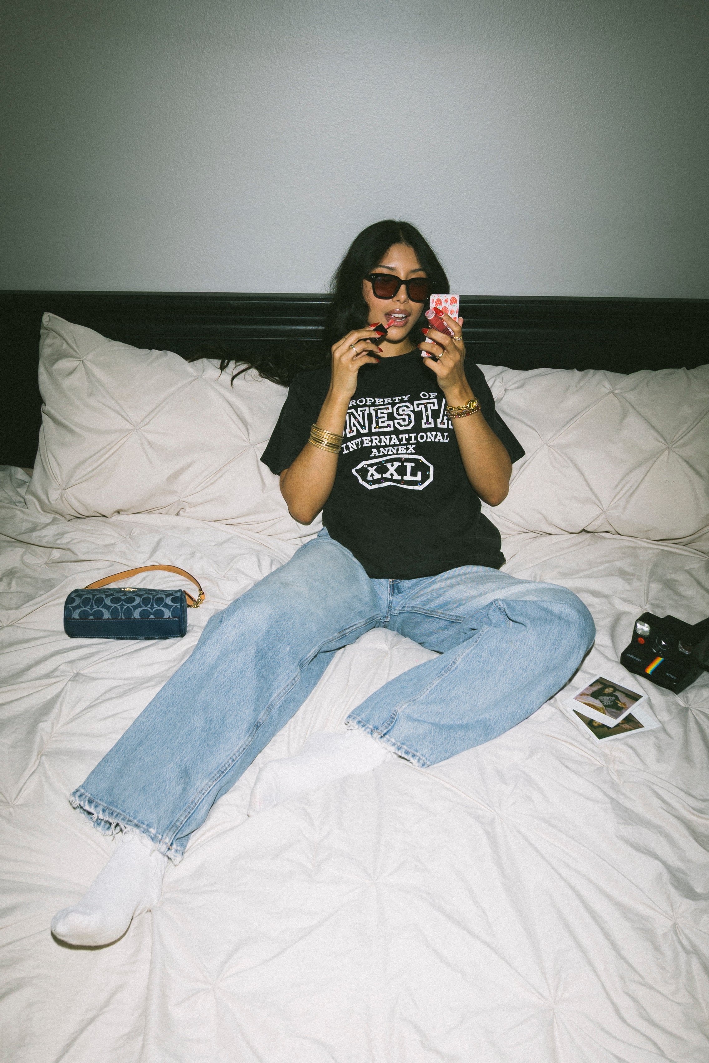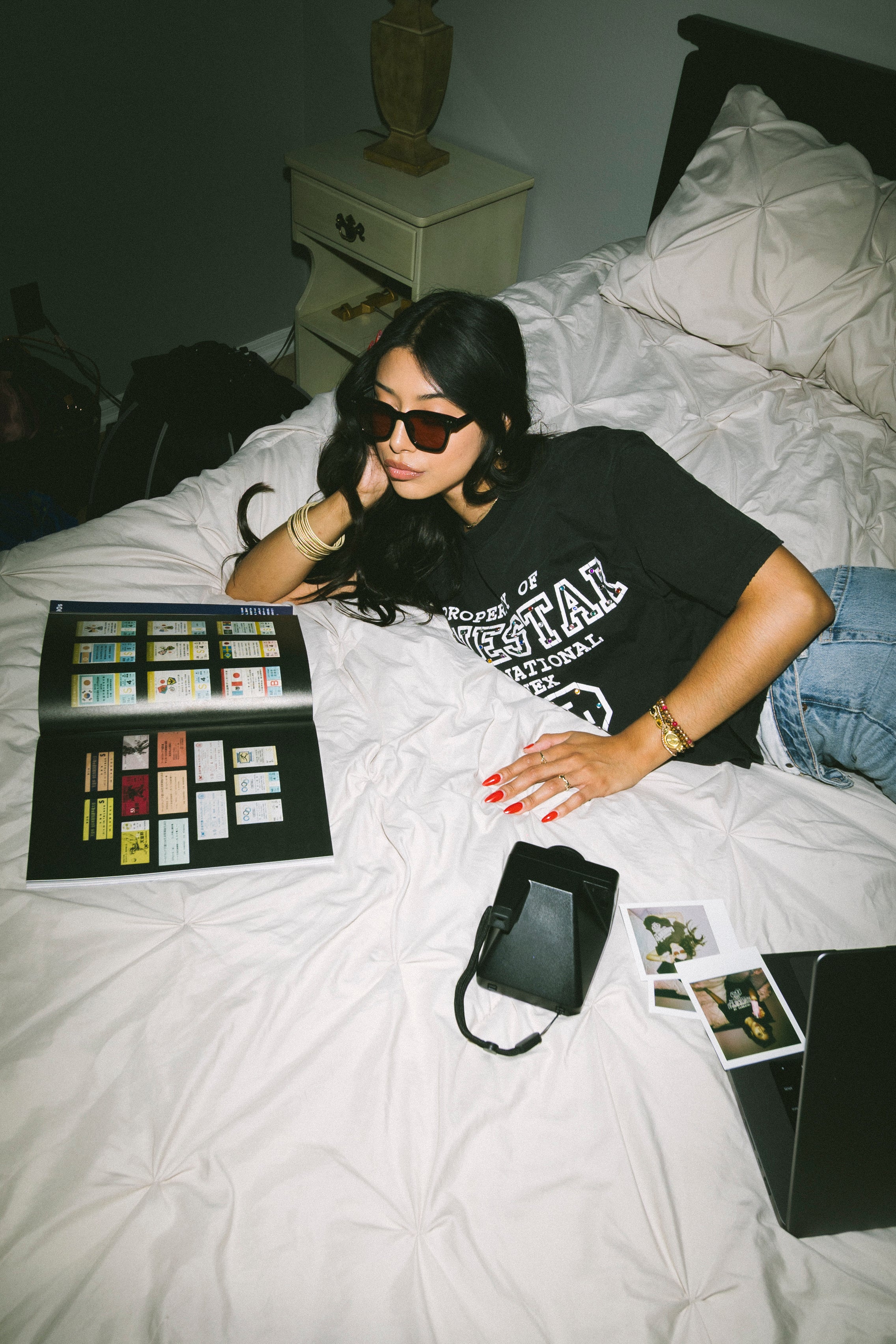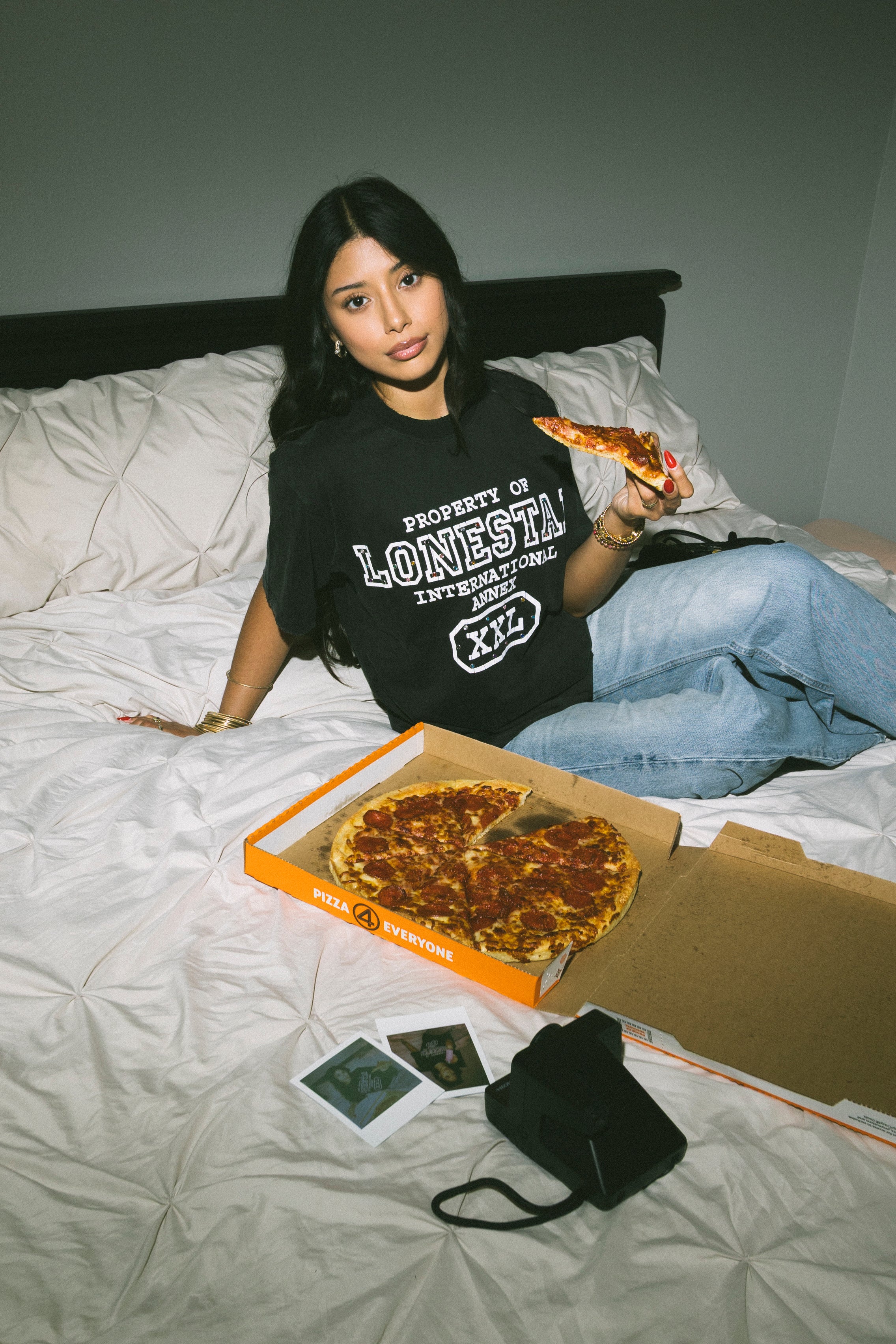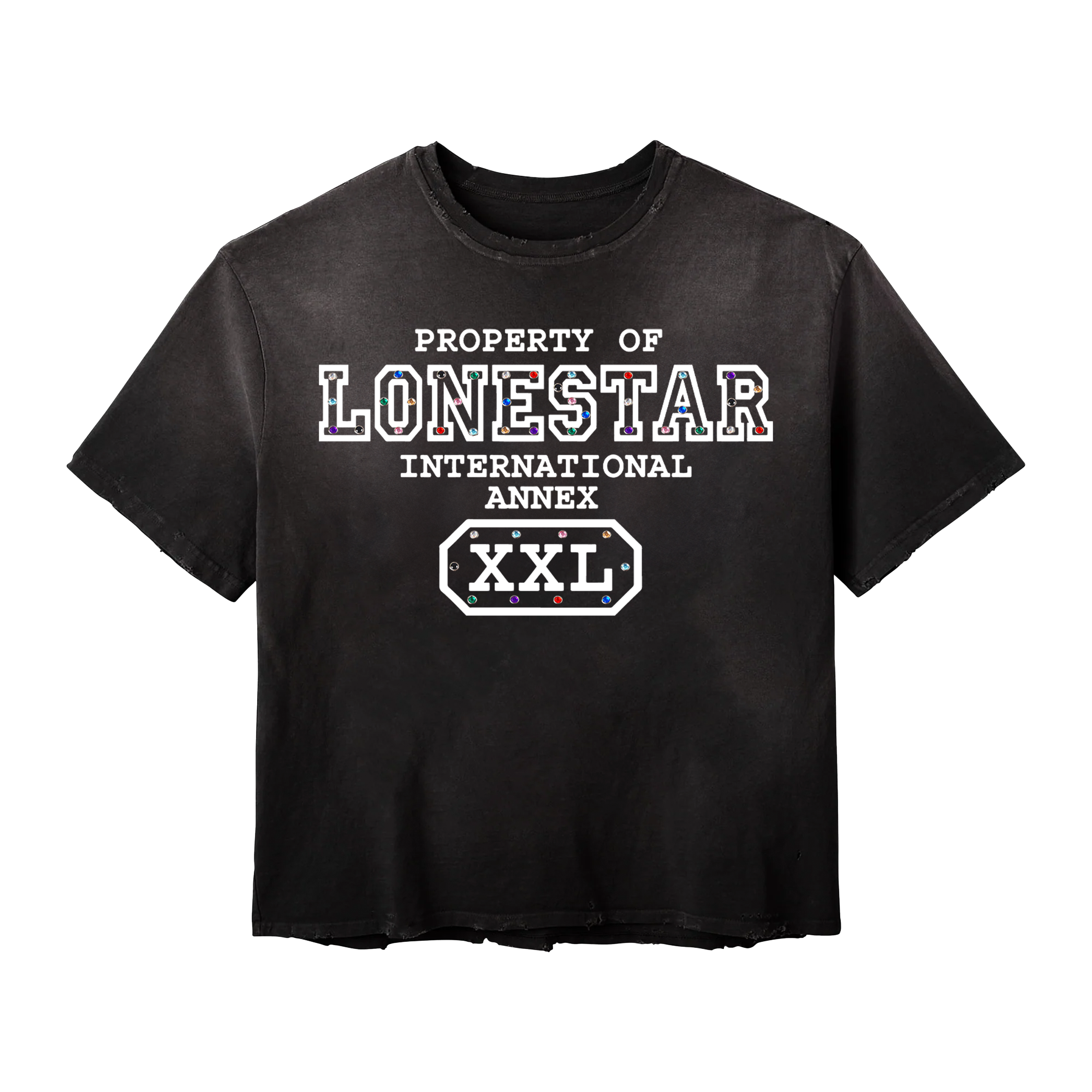 BLACK SHIRT, WHITE SCREEN-PRINT, GEMSTONES